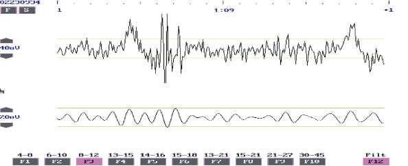 Gráfico de una porción de un EEG incluyendo las ondas filtradas de 8 a 12 Hz