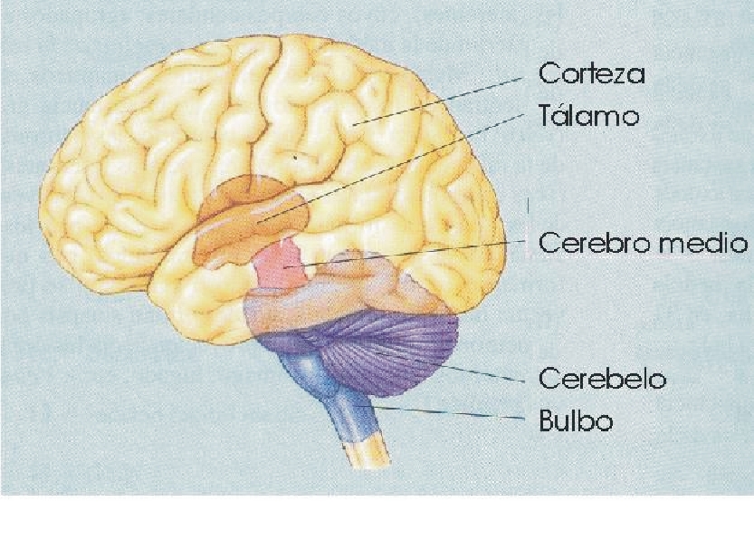 Las principales estructuras comprenden en orden ascendente, el bulbo raquídeo, el cerebelo, el cerebro medio o mesencéfalo, el tálamo, y la corteza cerebral que incluye el sistema límbico.