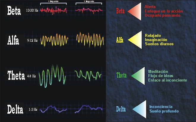 Se distinguen 6 grupos de ondas principales: ondas delta (0.5 a 3 hz.), ondas theta (4 a 8 hz.), ondas alfa (9 a 12 hz.) ondas SMR (12 a 15 hz.) ondas Beta (15 a 30 hz.) y ondas gamma (30 a 40 hz.) Cada grupo de ondas se caracteriza por un estado típico de conciencia y viceversa. Por ejemplo las ondas theta son característica de estados de sueño poco profundo mientras que las delta se producen en el sueño profundo. Las ondas alfa se asocian a estados de relajación y sueños diurnos (ensoñación) mientras que las ondas SMR indican actividad externa pero relajada y las ondas Beta corresponden al estado despierto o de vigilia.