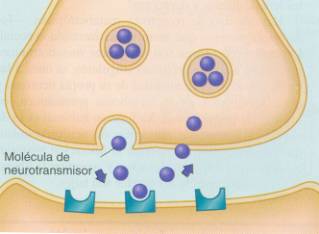Los neurotransmisores son compuestos químicos que trasmiten la estimulación eléctrica de una neurona a otra. Se almacenan en pequeñas bolsas denominadas vesículas sinápticas alojadas en los botones del axón. Pueden ser de cinco tipos diferentes a saber: los aminoácidos, las mono aminas, los gases solubles, la acetilcolina y los neuropéptidos. Se producen dentro de la neurona a partir de aminoácidos como la tirosina y el triptofano.
