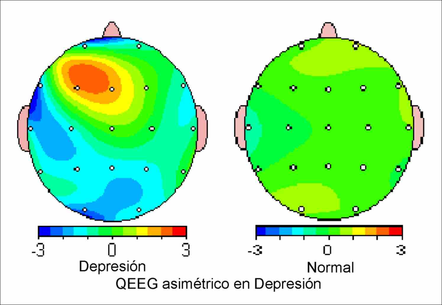Los estudios mas recientes muestran que en este caso, es posible diagnosticar la depresión mediante el mapeo de ondas cerebrales. Obviamente no todos los casos podrían ser tan evidentes como el de la imagen que mostramos a continuación, pero siempre, un análisis detallado del QEEG de la persona mostrará los resultados.
