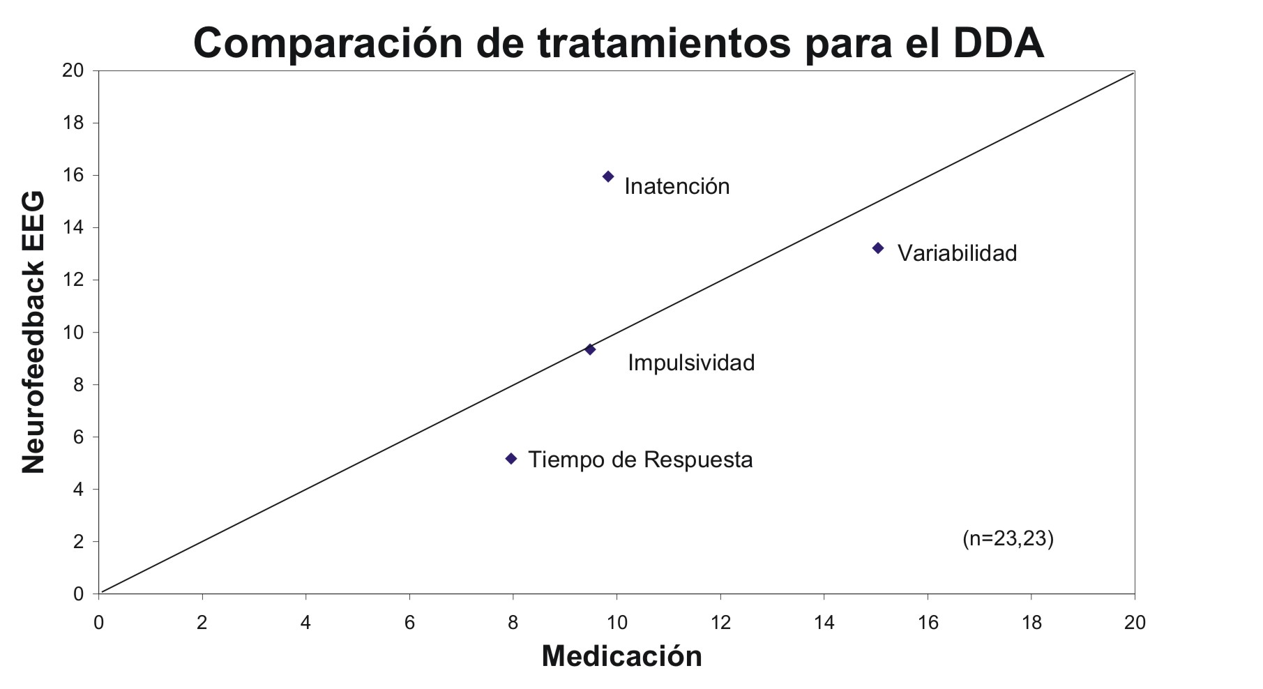 Veamos a continuación el cuadro resumen del estudio de los doctores Thomas R. Rossiter and Theodore J. Lavaque, consultores especializados en el tema, realizado en el año de 1995, donde aparecen las mejoras en porcentaje, alcanzadas ya sea con el Neurofeedback o con la medicación.